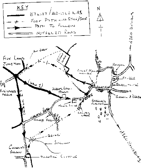 At Five Lanes Junction take the second opening on your left (PP No.109)-Note that the third opening is a private road to Five Lanes Farm. After about 700 yards this byway has its junction with Joiners Lane (PP No.113) and Worton Road at West End, turn right and follow the Worton Road to Cuckold's Green, just before reaching Turnpike Cottage (on your left) a farm track (PP No.53) runs off to the left, here at its junction with the Worton Road a finger post points your direction along the field path (PP No.60).
