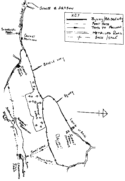 Follow the path to the gate in the top righthand corner of the field, here you have a choice of two paths which in turn leads to a second choice of two paths, which we will call 'Short', 'Medium' and 'Long' ways home.