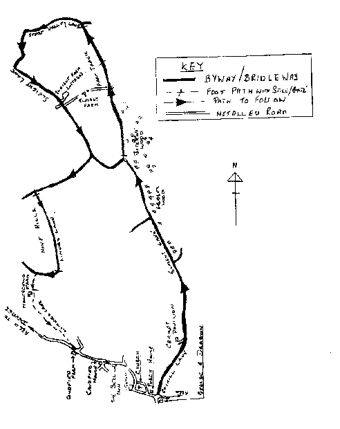 Take the road opposite the George & Dragon (See Note-2) Coxhill Lane, pass the turning to the left at Woodbridge House and continue to follow Coxhill Lane which now becomes a byway (PP No.50), after about 130 metres you will pass Sugarwell Farm (See Note-1) on your right, your way now passes between steep wooded banks to a cross roads. Here the road to the right is also a byway - Stroud Hill (PP No.52) leading to the Urchfont road by Stroud Hill Farm, but we continue straight ahead until after about 170 meters you will have Grubbe's Wood on your right, this was once the property of the Grubbe family (See Note-6). Grubbe's Wood is immediately followed by Potterne Wood, shortly after the merging of the two woods (approximately 170 meters from their intersection) the byway (PP No.50) turns sharp Left. You now have a choice of walks. SHORT WALK